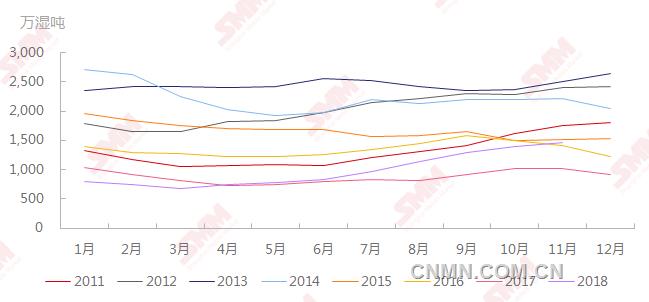 如上图所示,每年国内港口库存会从1月份的高位逐渐回落,因工厂处于消库阶段,直至5月份达到库存低点后重新转入上行走势,最终在11月份左右再次下降。究其原因,菲律宾为中国2014年-2018年红土镍矿的最大来源国,而其最大的出货矿区苏里高地区在每年的11月份-来年的3月份处于雨季,将暂停出货,因此工厂会在5月份-10月份逐渐加大采购量,为雨季做准备。